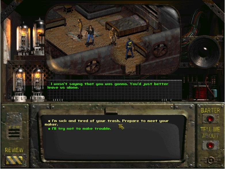 I'm blindly running through the original Fallout for the first time. I know, I know, I should've done this 16 years ago. My first episode was eye opening because the targeting system, VATS, lets you hone in on your enemy's tender bits. Which I did. With my brass knuckles. This episode, I figured out that bookshelves are Fallout's equivalent of treasure chests. Which I plunder. Vigorously.